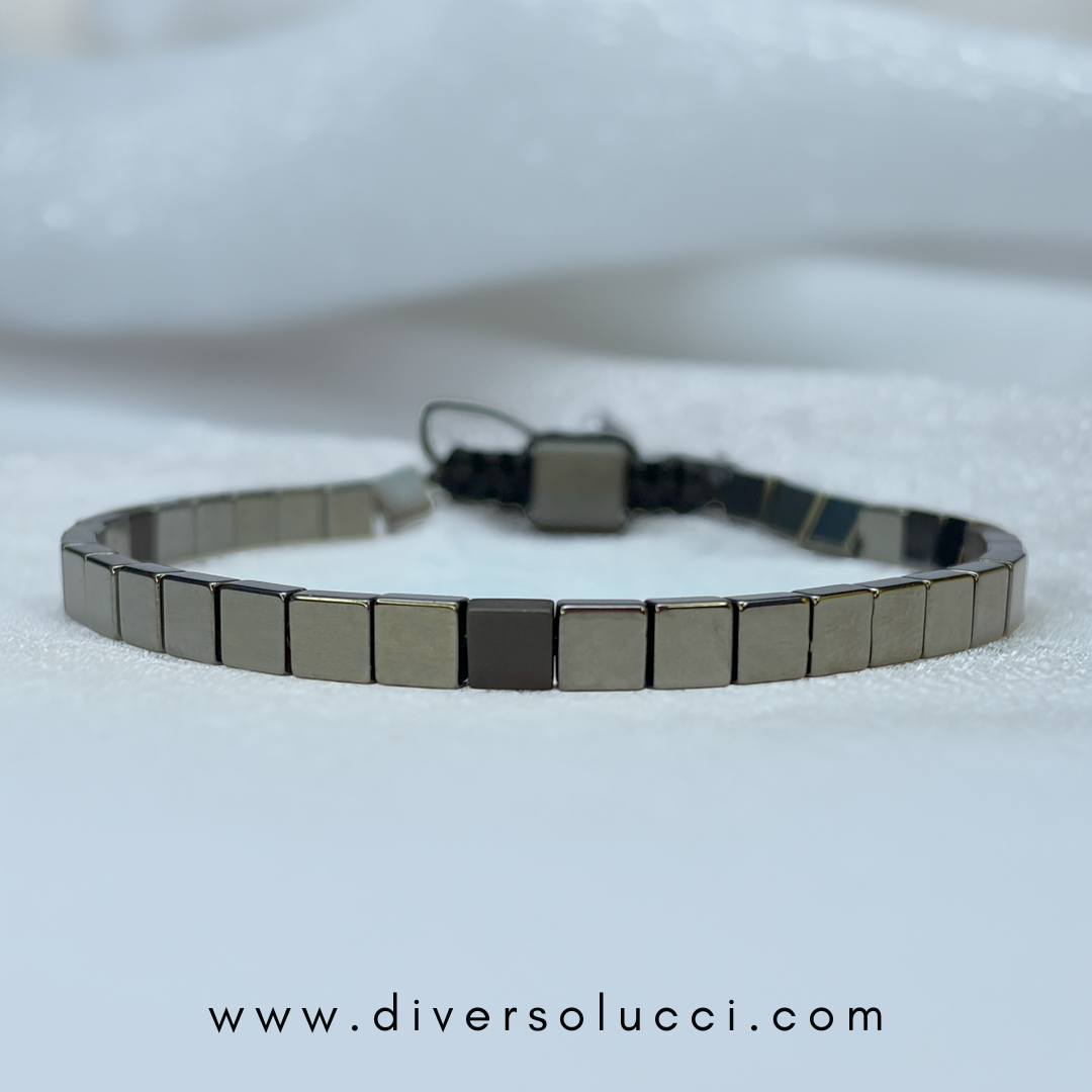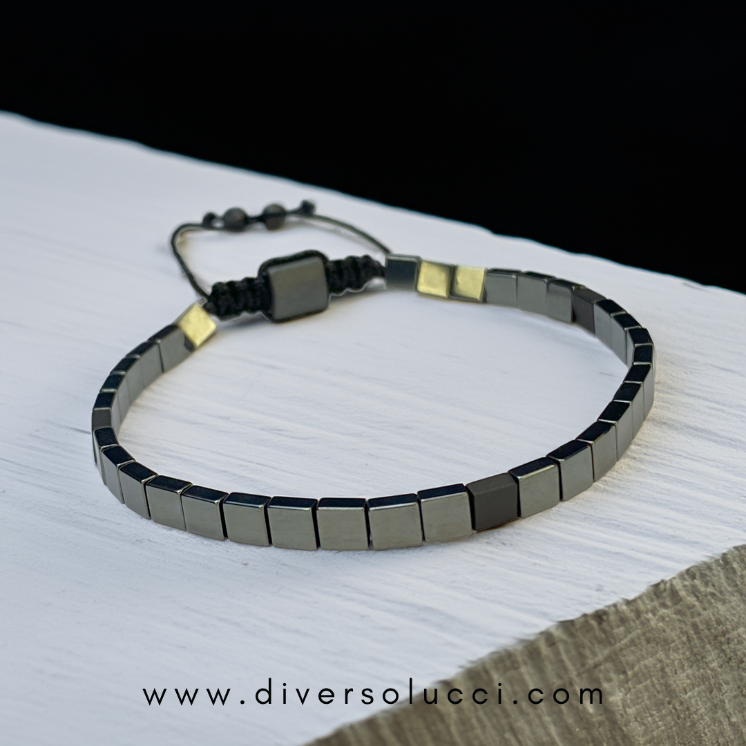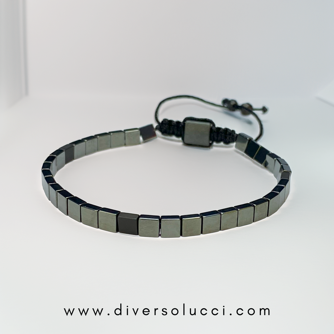 İtalyanca’da “güçlü” anlamına gelen Robusto, adını tasarımıyla fazlasıyla hak ediyor. 4mm’lik kare kesim füme hematit taşların net geometrisi, bilekliğe erkeksi bir duruş ve modern bir estetik kazandırırken, makrome yapısıyla her bileğe tam uyum sağlar.